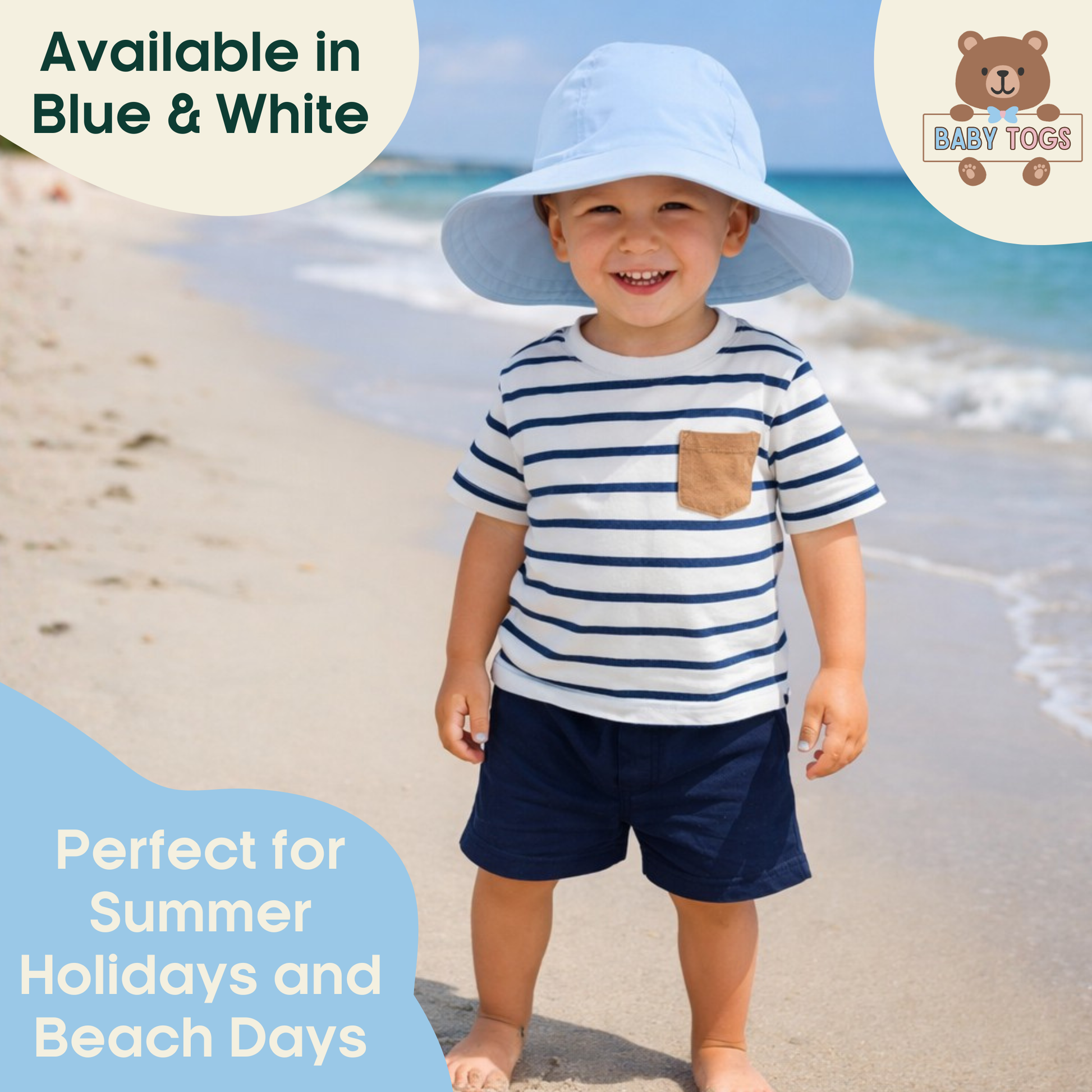 Our Baby Boys Wide Brim Sun Hat is crafted from 100% cotton to help keep small heads cool in warm weather. The wide brim adds extra shade for the face and neck, making it a go-to baby summer hat for holidays, beach days, and everyday outings.